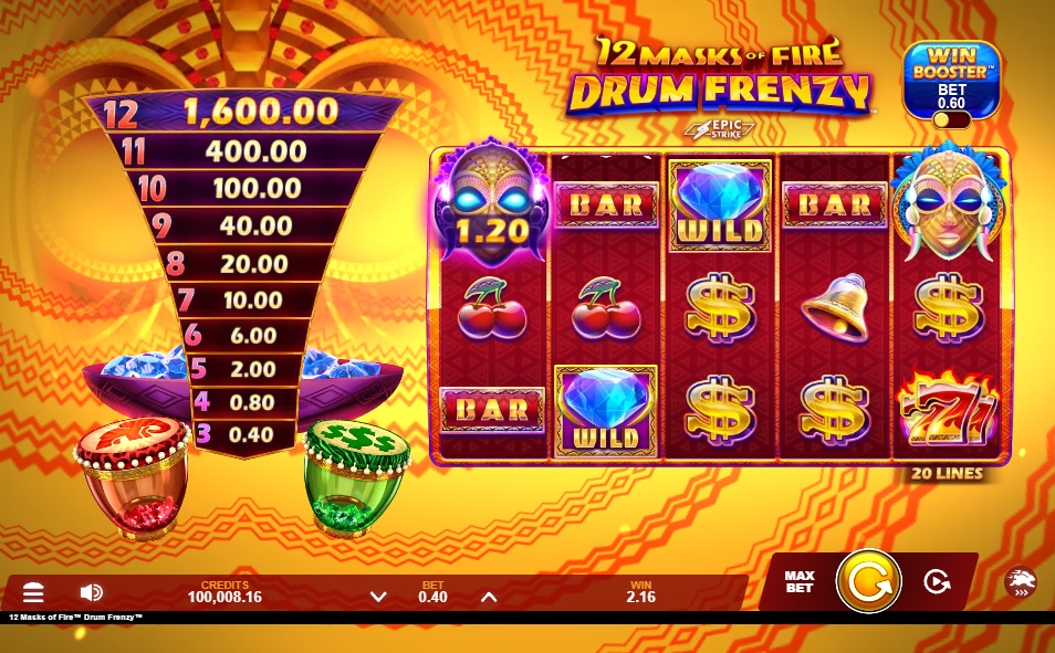 The 12 Masks of Fire Drum Frenzy Slot improves on a popular formula by adding a percussion-based theme, making prize information clear, and putting more emphasis on scatter ladders and free spins multipliers.