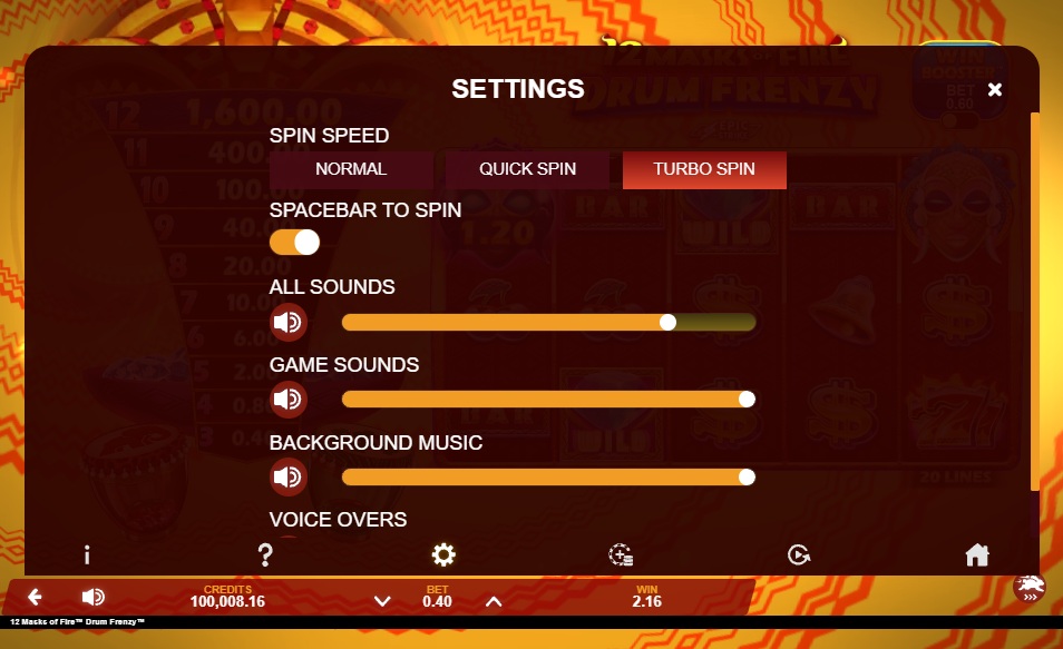 The interface keeps things simple so that key options are easy to find. The main panel lets you change the sound, quick spin, pay table, and rules. If you want to play the 12 Masks of Fire Drum Frenzy Slot for a long time, you might want to change your stake to match your bankroll and the number of times the features appear, since mask and free spins triggers tend to decide how the session ends.
