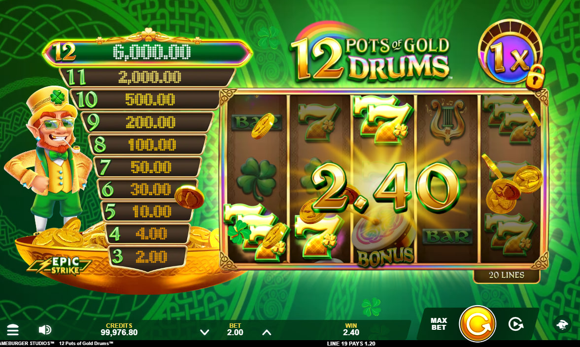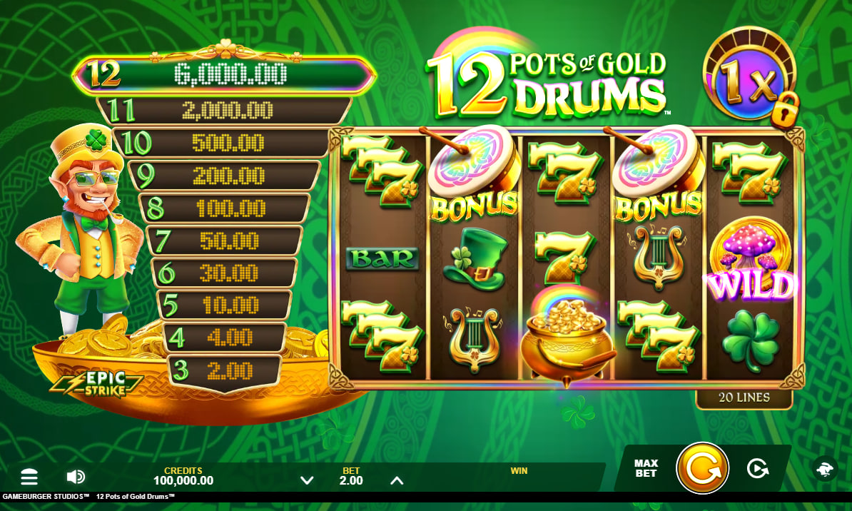 12 Pots of Gold Drums blends Irish luck iconography with a percussion-led presentation. Developed by Gameburger Studios for the Games Global network, this 5x4 video slot uses 1,024 ways to win and a medium-high volatility profile. The default RTP sits at 96.10%, around the market average, while max exposure reaches 8,000x the bet. Core symbols include clovers, harps, and bodhrán drums, with wilds assisting line-building on the ways engine. Pots scatters can award instant cash or unlock feature rounds, providing intermittent boosts between bonuses. Stakes scale from low to moderate limits, and performance is optimized for modern mobile devices.