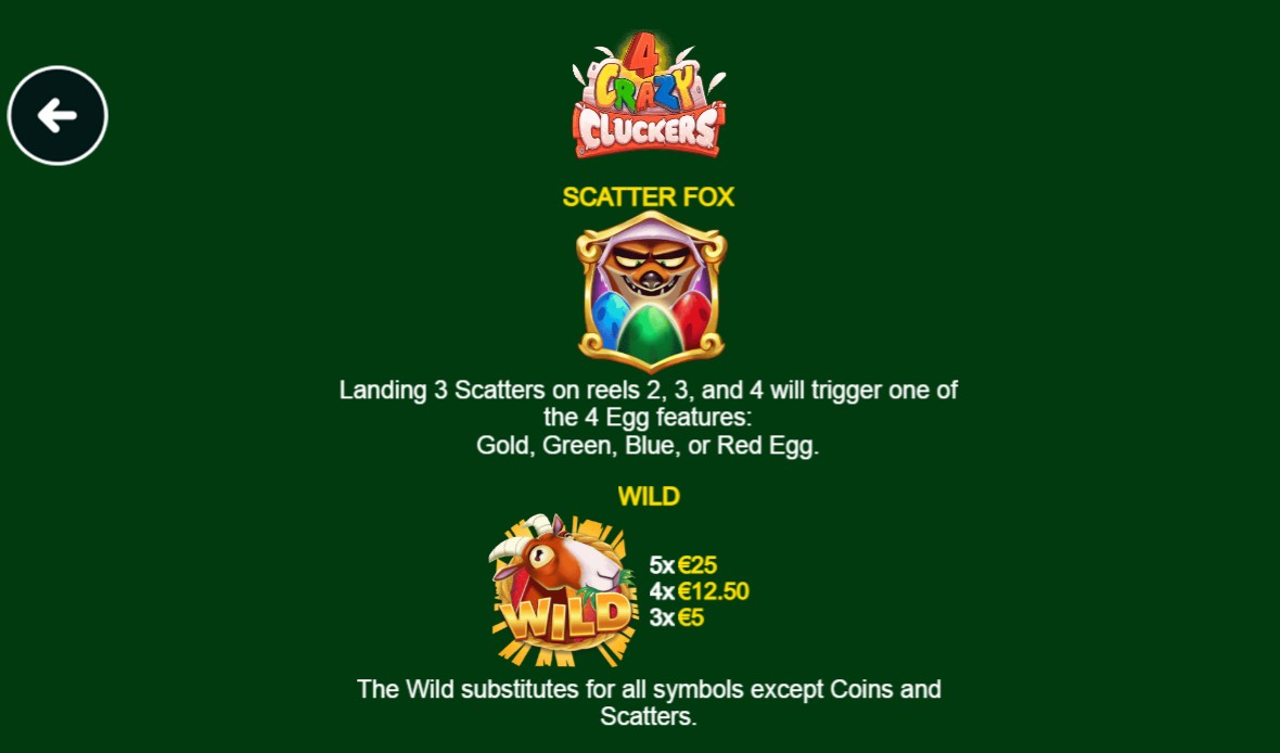 Free spins are the main feature and have the most potential to be session highlights. The 4 Crazy Cluckers Slot uses scatters to start the bonus round, which adds more wilds and multipliers to boost winning lines.