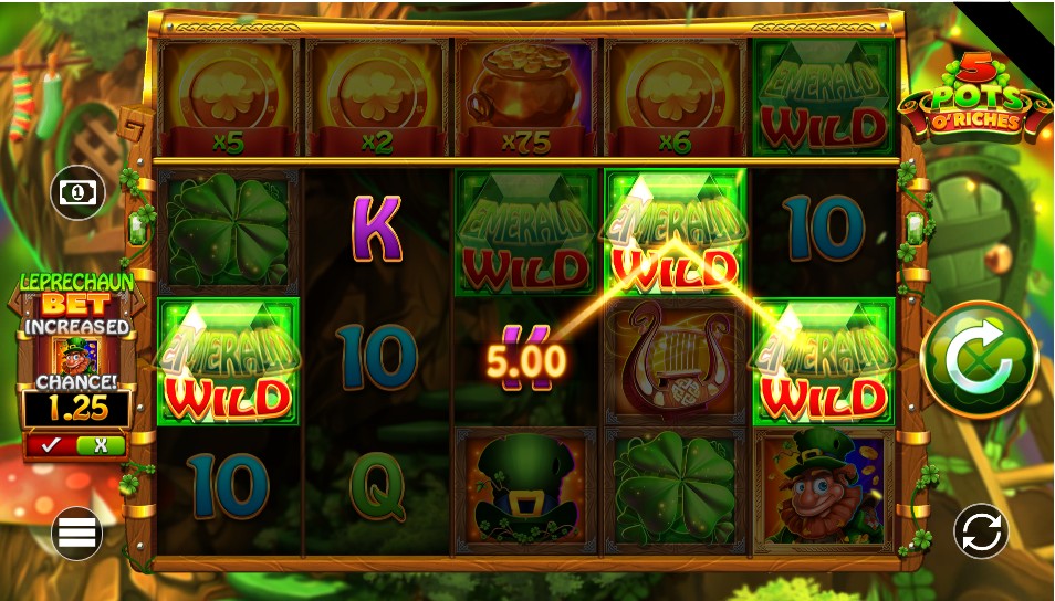 Some kinds of wilds may come with a multiplier that stays in place during free spins or is applied to a single base game result. This happens in 5 Pots O' Riches, and the payout step up can be seen right away in the win count up. With its own sound effects and animations, the 5 Pots O' Riches Slot hints at wild action right away, so you don't have to look at the paytable again.
