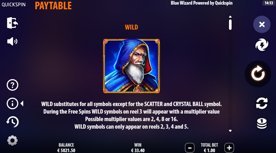 Figures that show how much you can win and the symbols that appear on the Blue Wizard Slot have a clear order. Lower pay is typical for royals, while middle to high pay fits with the theme. Along with the owl, the cauldron, spellbook, and ring are the most valuable symbols. The castle is the Scatter symbol, and the Wizard is the Wild symbol that can be used in place of any other symbol. Crystal Balls show fixed jackpot amounts or cash values in the form of stars during the respin feature. Symbol art stands out, which makes it easy to read, even on small screens, where wins are easy to find. Depending on the situation, values in the paytable are shown as multipliers of your line bet or total bet.