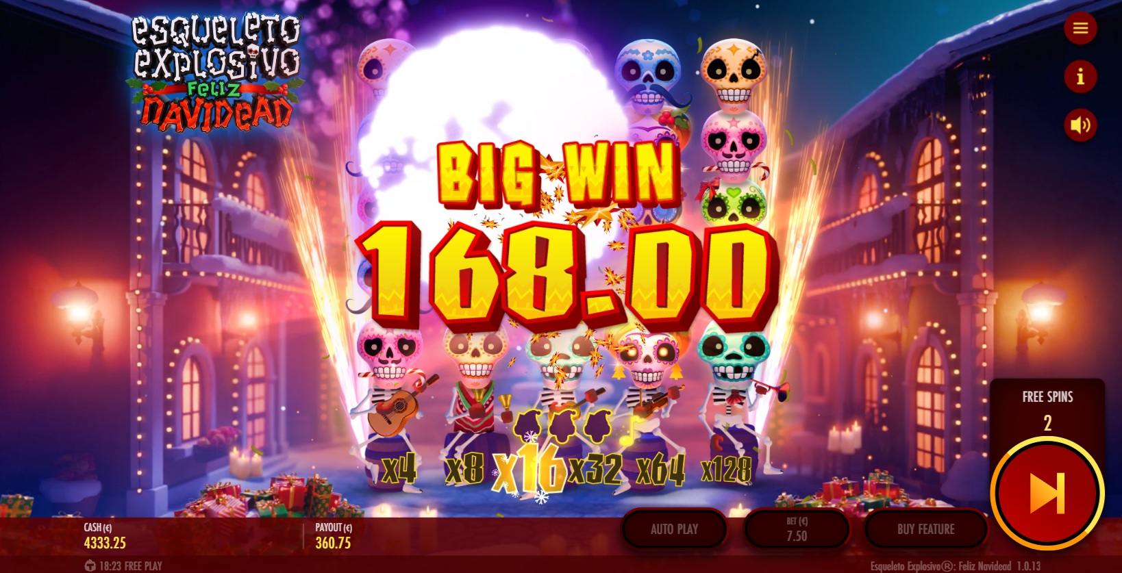 In the base game, the Esqueleto Explosivo Feliz Navidead Slot uses the usual multiplier progression, but in free spins, the ceiling is pushed even higher to create a bigger burst potential. RTP settings are different in each country, so it's best to check the in-game help panel. Esqueleto Explosivo Feliz Navidead falls in line with your tastes if you like loud peaks followed by quieter sections.