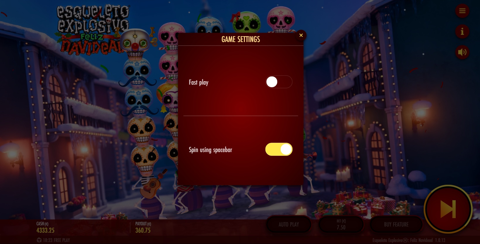 - For Esqueleto Explosivo Feliz Navidead, use the help panel to check the RTP settings and localized rules.
