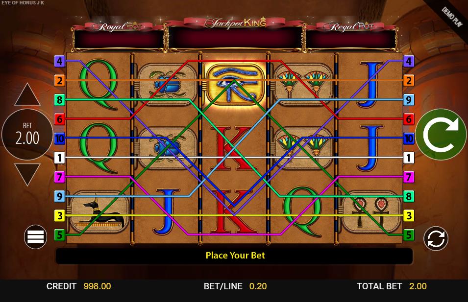 It's easy to get started with Eye Of Horus Jackpot King Slot. Set your bet using the bet controls, make sure you're happy with the total bet that's shown, and then spin. From the leftmost reel, wins are calculated across 10 fixed paylines. The paytable sets the values of the symbols.