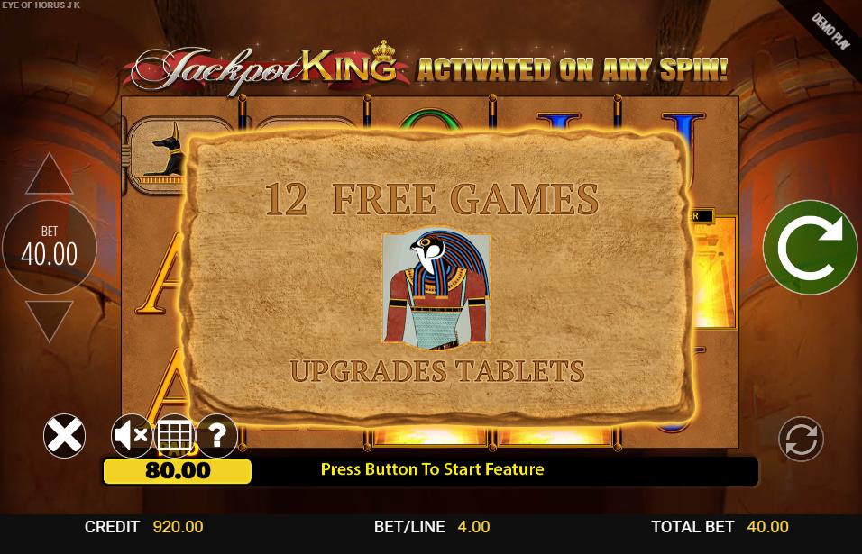 Many people like free spins the most. When three or more scatters land, you get 10 free spins. Each Horus wild that lands raises the level of the picture symbols below it. As the feature goes on, mid-level symbols move up until the top symbol takes over. At that point, the quality of line hits can really improve. At this point, Eye Of Horus Jackpot King Slot does very well, and it looks like longer features with retriggers have a much better chance of producing outstanding results.