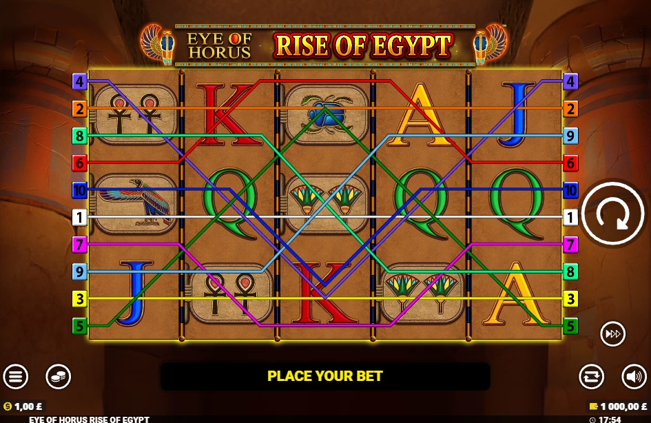 Eye of Horus Rise of Egypt continues the long-running series with a refined 5x3, 10-line setup and sturdier payout modeling. Developed by Blueprint Gaming, it pairs a 96.27% RTP with medium-high volatility, targeting sessions where streaks and upgrades drive momentum. The familiar expanding Horus Wild remains the backbone, helping complete lines by filling entire reels. Free spins push incremental symbol upgrades that can elevate low pays into stronger tiers. A broad stake range from 0.10 to 100 and a 10,000x maximum win make it adaptable for varied bankrolls and play styles.