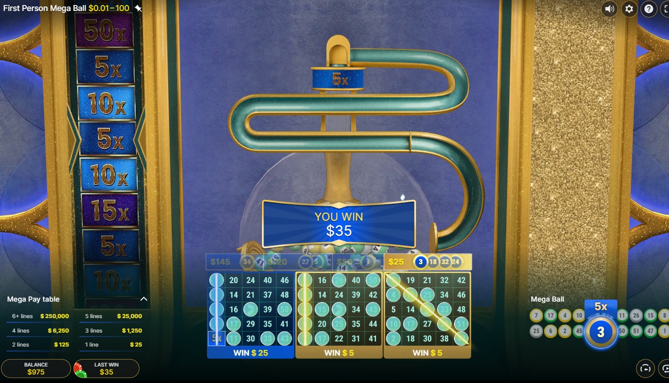 In order to win, a card must complete a certain number of lines. If the last Mega Ball connects on any of those lines, the payouts are bigger. It's most likely that the advertised maximum win multiplier will be reached in the last reveal of the First Person Mega Ball Slot.