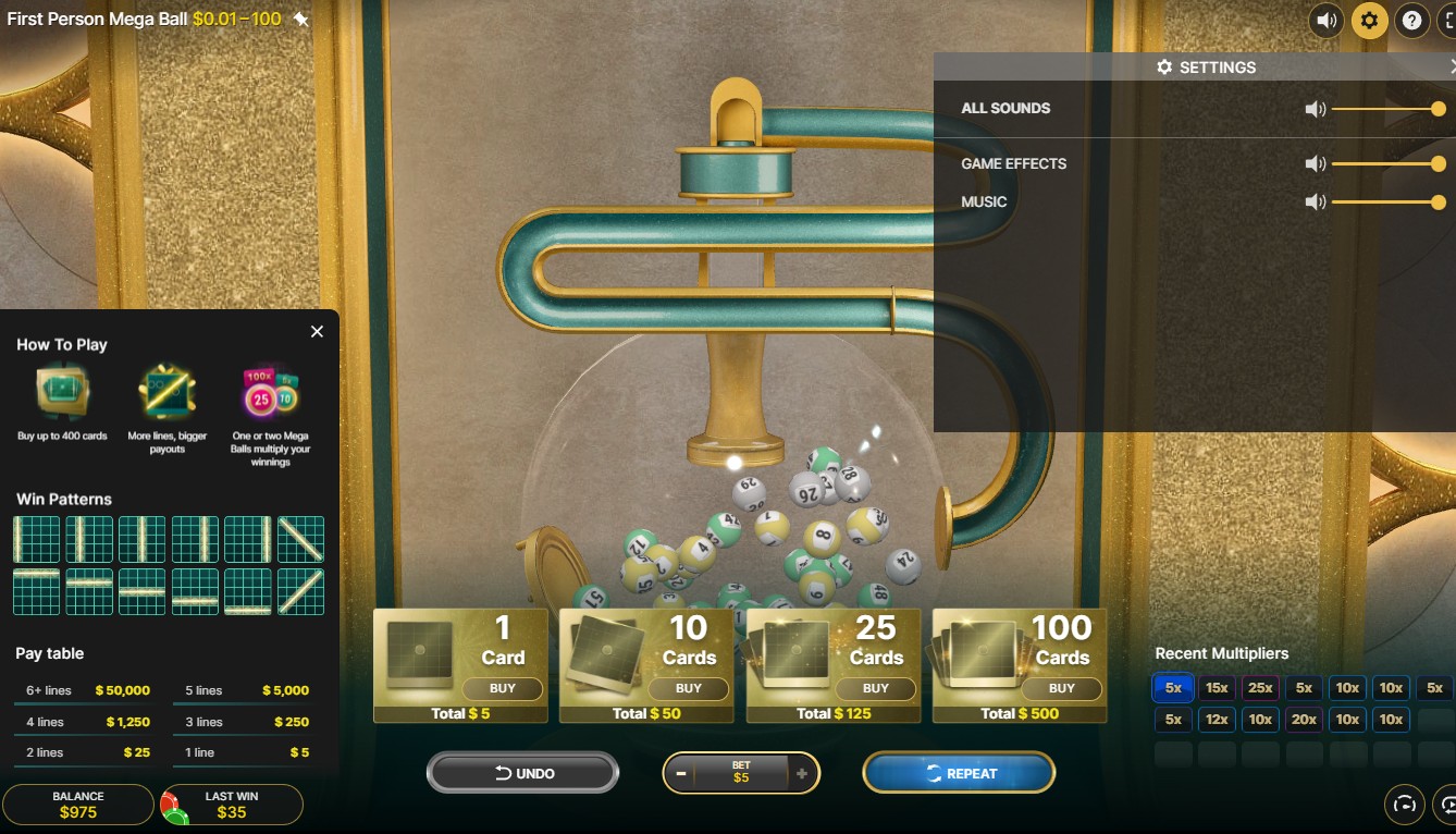 There aren't any typical slot machine symbols here. You get cards with numbers on them instead, and the goal is to fill in all the lines. It pays out based on the number of lines you play on the First Person Mega Ball Slot. Higher totals mean bigger wins. Several cards can pay at the same time if they all show qualifying lines. Because line rewards are so important, the structure gives the most weight to how many lines are on each card and whether the last ball lands on a line-starting position.