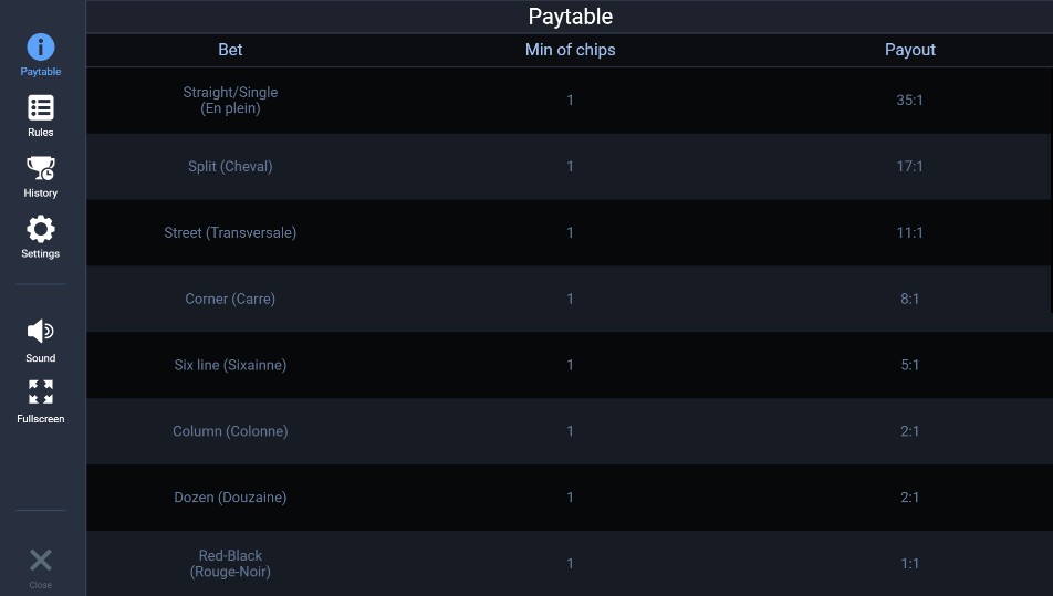 Roulette doesn't have symbols like slots do. Instead, the paytable is a list of different types of bets with set odds for winning. These odds are shown in the "Info" section of French Roulette Classic Slot. They are the same as those on regular European and French tables. When it comes to payouts, straight numbers pay the most per unit stake, while even-money bets pay the least but have the highest hit rate. It's easy to learn the bet grid once you know the difference between inside bets, which are on specific numbers or small groups of numbers, and outside bets, which are on bigger outcomes like red, black, odd, even, dozens, and columns.
