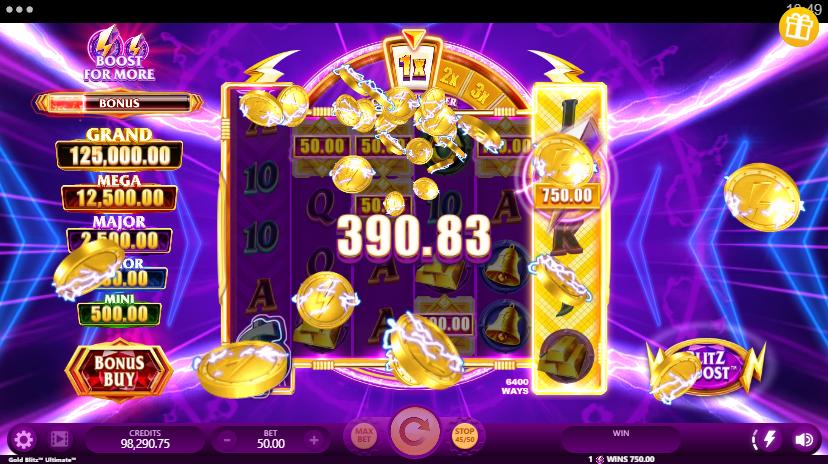 Gold blitz bonuses include wilds, multipliers, and free spins; this game's main features are its feature surges.