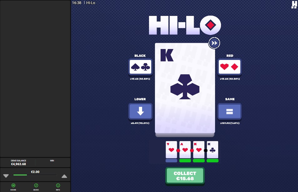 The Hi-Lo Slot is simple, fast, and based on a single choice: you can choose between high and low, and this happens quickly. Hacksaw Gaming's clean interface lets you play quickly on any device, while Hi-Lo's focus is on clear odds and simple inputs instead of complicated reel layouts and large feature sets. It's the kind of release that rewards paying attention and managing your bankroll over reading a lot of symbols. For speed-loving players, Hi-Lo has short rounds and an easy-to-learn loop. The game's theme is matched by clean graphics.