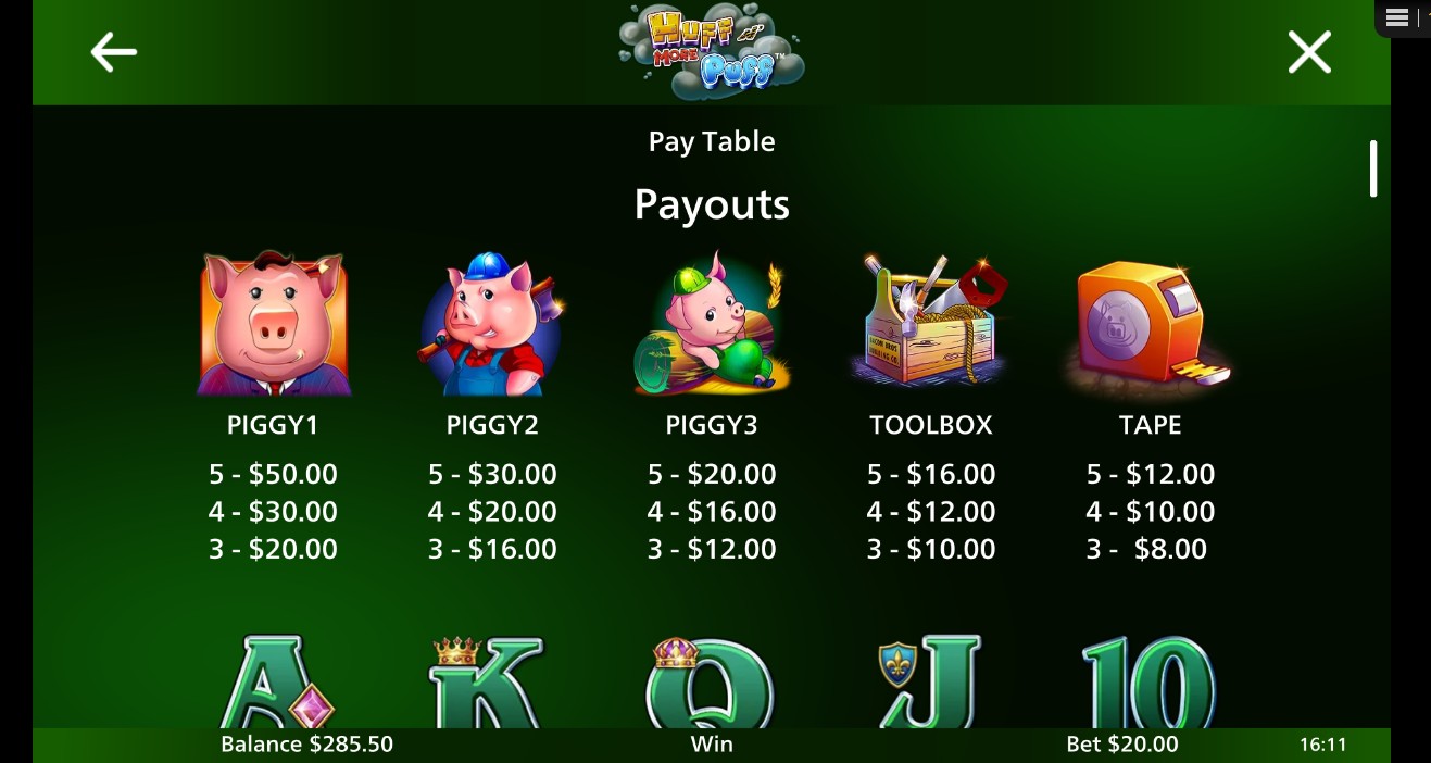 The premiums are in line with the characters and the construction theme, and the lower tiers are where cards normally go in the deck. When it comes to top line wins, the Huff N' More Puff Slot puts more weight on the wolf and the pigs. Household items can help connect the symbols. It's worth mentioning that the way values are spread out makes sure that totals stay the same across 25 lines. This means that medium wins can happen often when premiums are right.