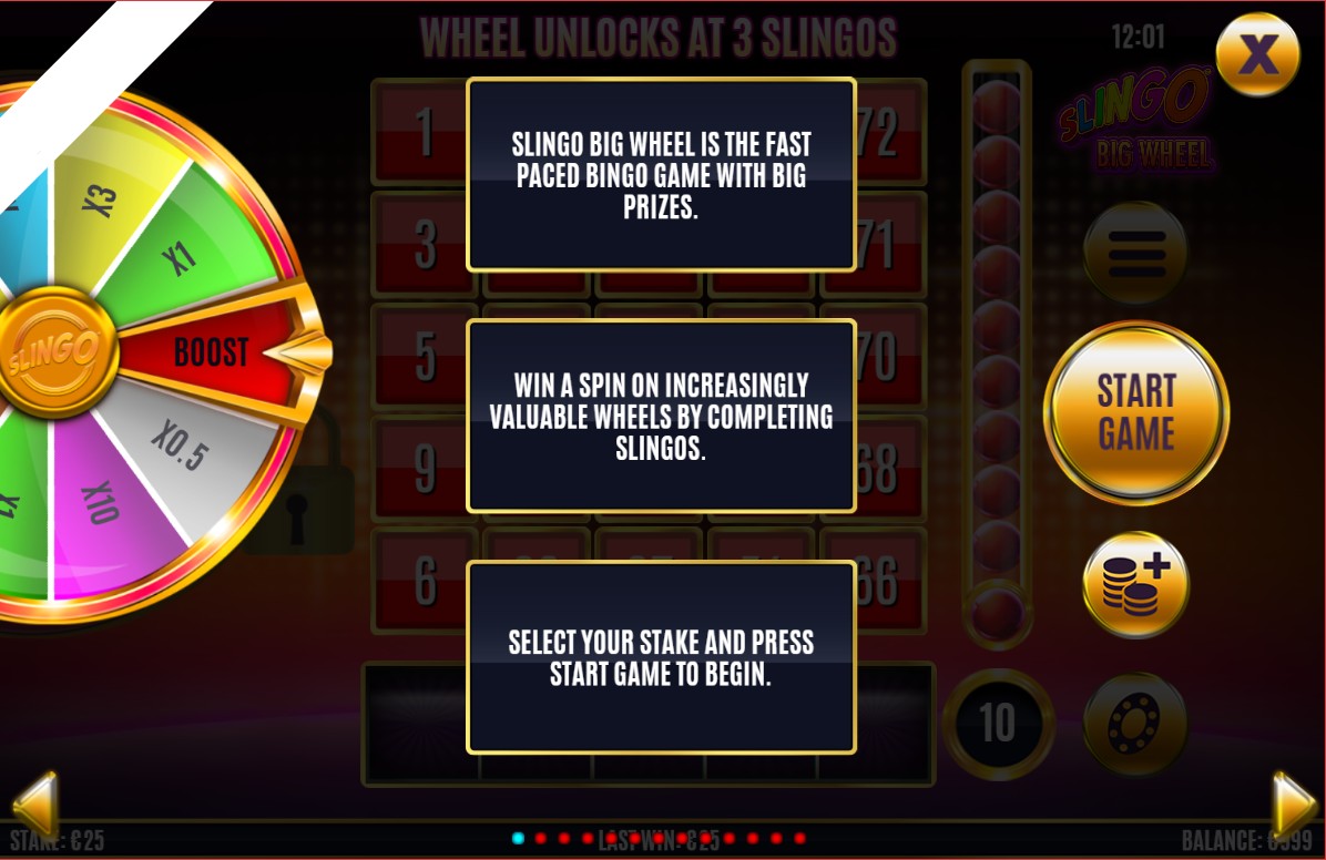 It's easy to get started. Set your bet and look over the pay table to see how the prizes for each Slingo line stack up. You try to make matches on the 5x5 grid by marking off the numbers that the Slingo Big Wheel Slot picks for each round. You can pick a number to mark in a row with a wild, and special icons give you extra chances to win. Most of the time, Slingo Big Wheel has quick prompts that show the best picks when wilds show up. This makes the game easier to understand.