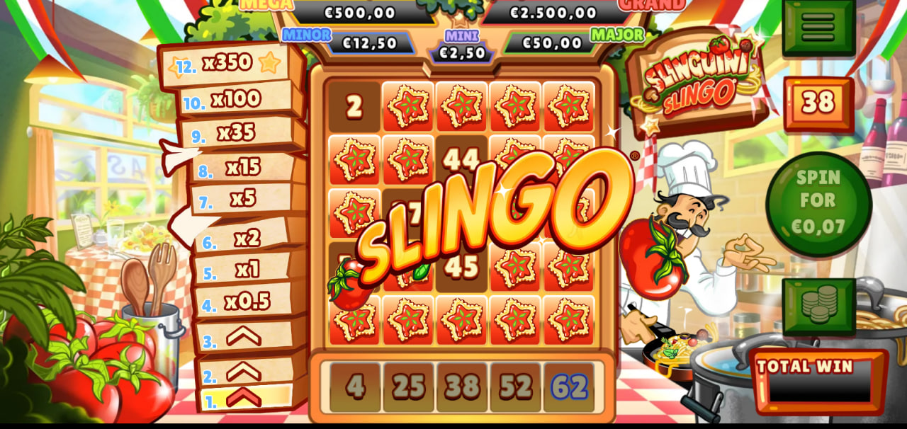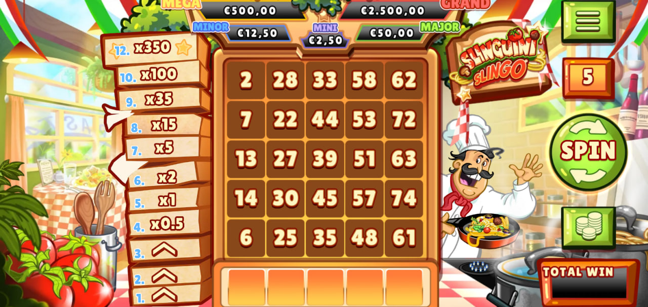 This installment keeps the core loop snappy: five base spins set the stage, and optional extra spins (where permitted) offer more chances to finish lines at escalating prices. Alongside prize upgrades for 1–12 Slingos, the game sprinkles in multipliers, power-ups, and a light bonus pick round that leans into its trattoria theme without slowing pace. The interface is clean on mobile and desktop, with crisp number highlights, clear pay ladders, and gentle acoustic cues rather than overstated effects. The result is an accessible grid game with enough depth for session-based play.
