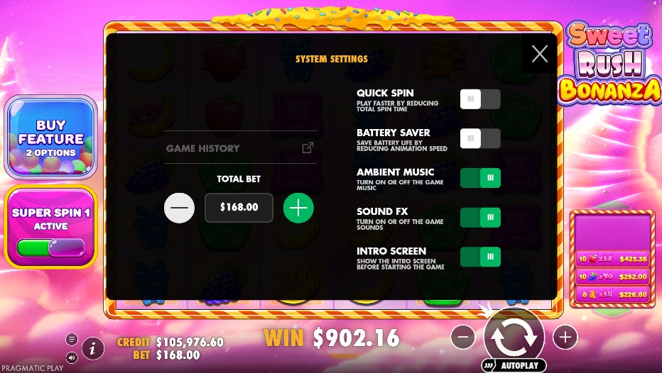 It's possible for the same paid spin to give you more wins because the tumble engine takes away winning symbols and adds new ones to the grid after each evaluation. This will keep going until there are no more wins. The bet and feature toggles are placed near the spin control on the interface so that they are easy to reach. With most versions, you can choose between two settings. The Ante Bet increases the total bet to improve the chances of getting free spins, and the Feature Buy, when available, lets you go straight to the bonus round for a larger bet than the base bet. You can easily try out different settings in the Sweet Rush Bonanza Slot because all of these toggles are visible and described in the rules panel.