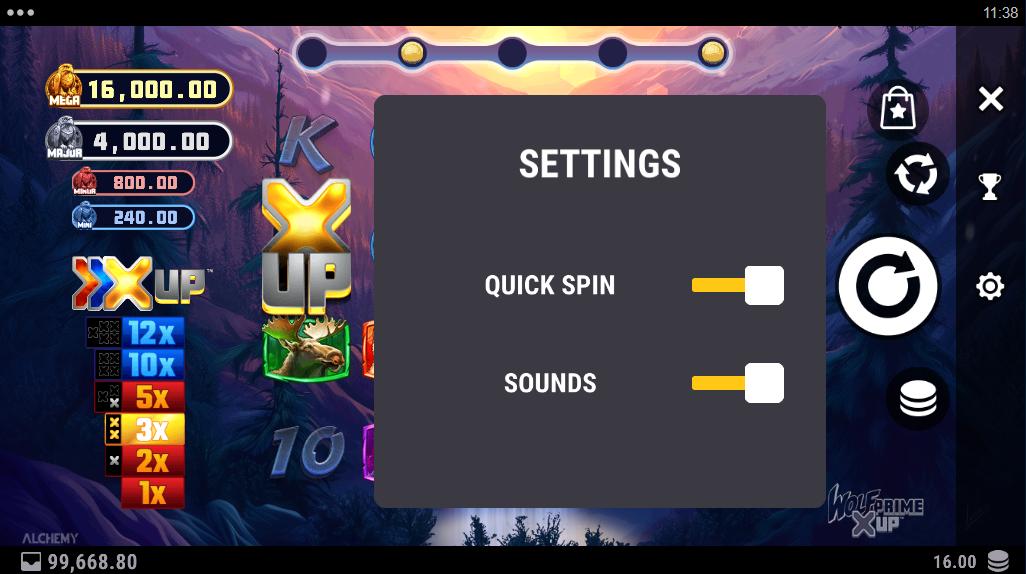 The Wolf Prime X UP Slot's theme and story are set against a moonlit sky, and the story is told through themes of the nighttime wilderness all the way to the bonus round. Keystone icons that control the game's feature economy are next to totems, pawprints, and stylized card ranks. While not being dark, the effect is moody, and the music is a steady mix of ambient and tribal percussion, making it good for longer sessions.